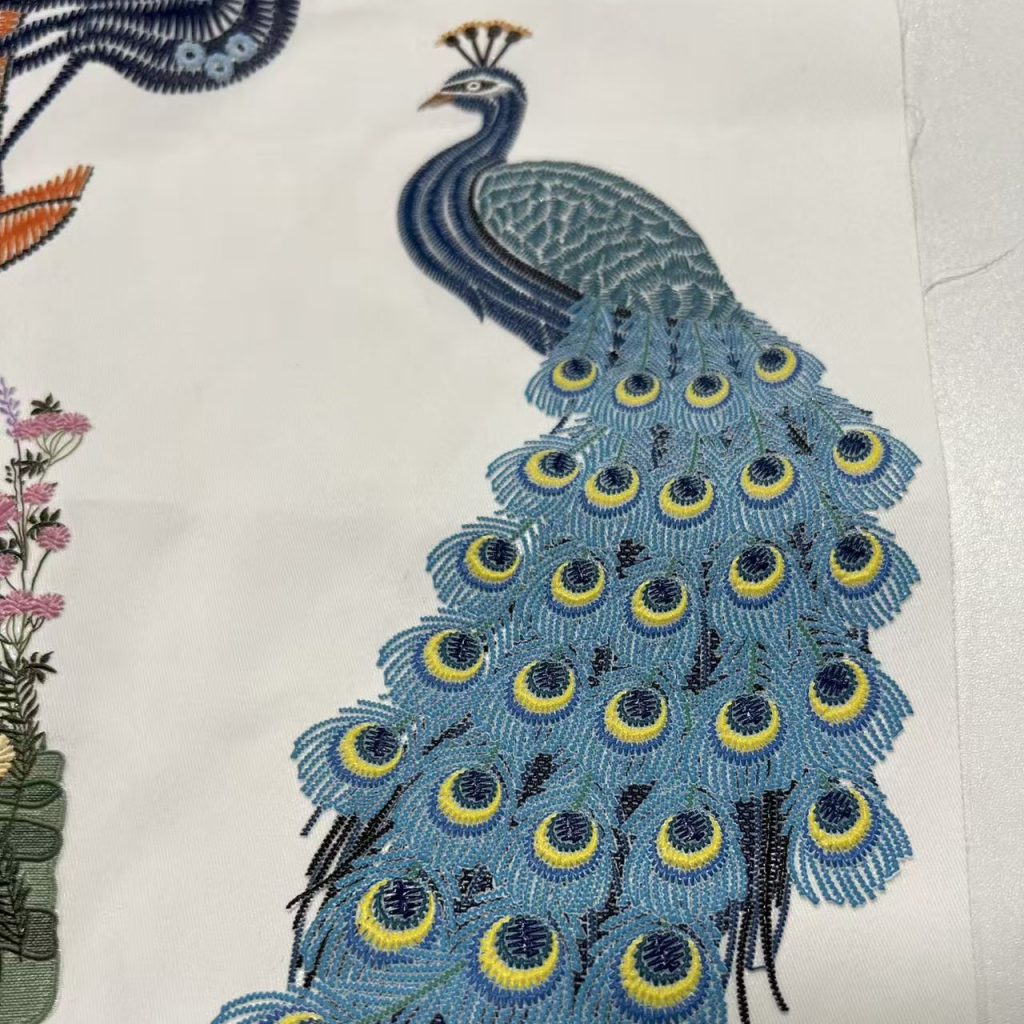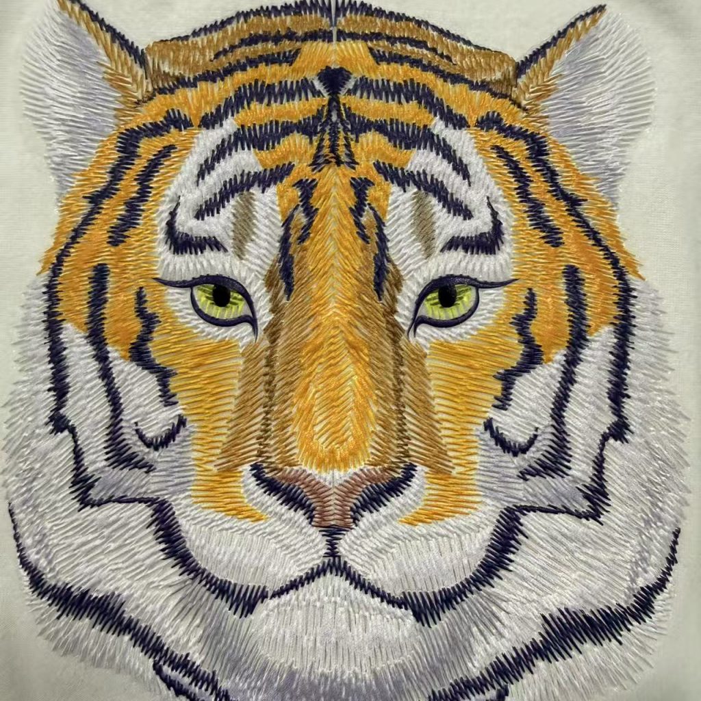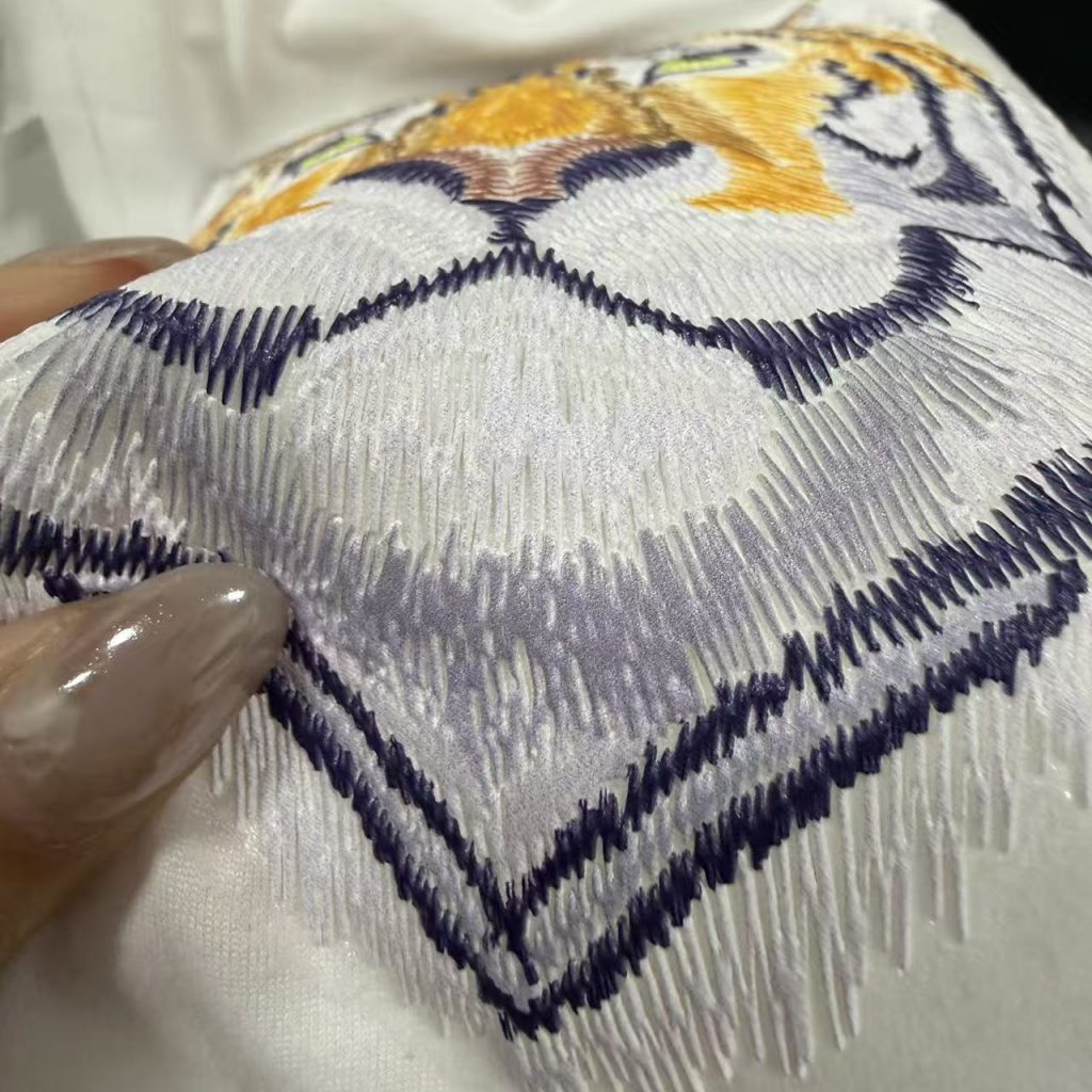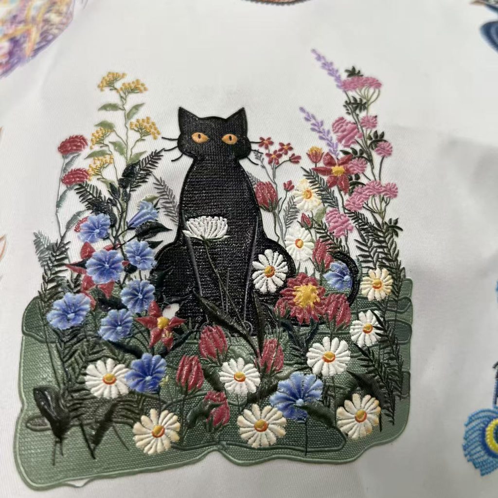 3D realistic embroidered texture prints with secure adhesion on cotton, polyester, and blends.